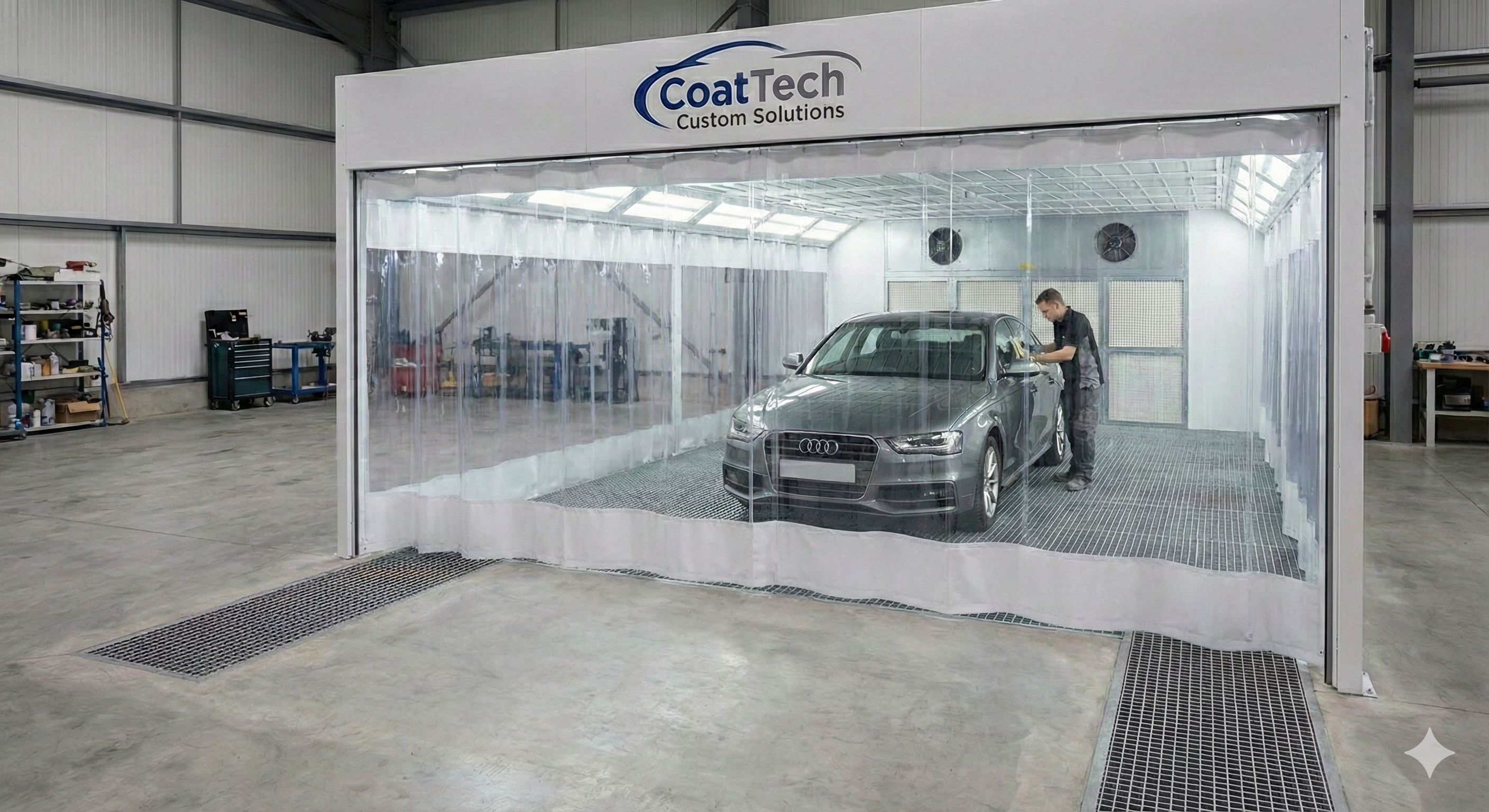 PVC-Vorhang-GehäuseIm Gegensatz zu einer festen Kabine verwendet die Prep Station verschiebbare PVC-Vorhänge.