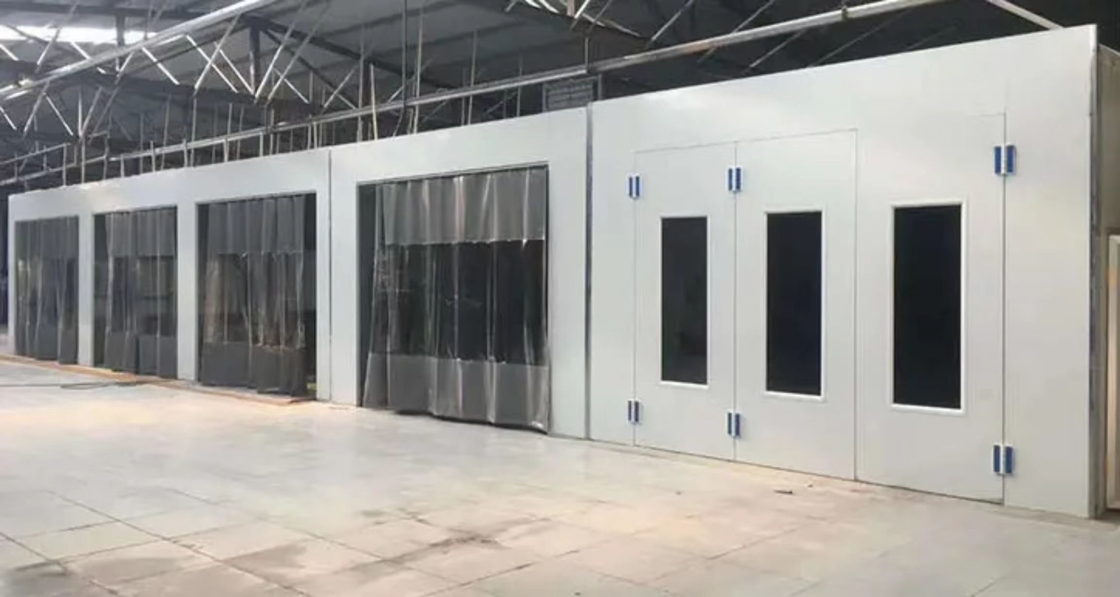 Vorbereitungsstation für die Lackiervorbereitung, Doppelbucht-Modell mit ebenerdigem Einstieg, hinteren PVC-Vorhängen und Filterung für Spot-Lackierung