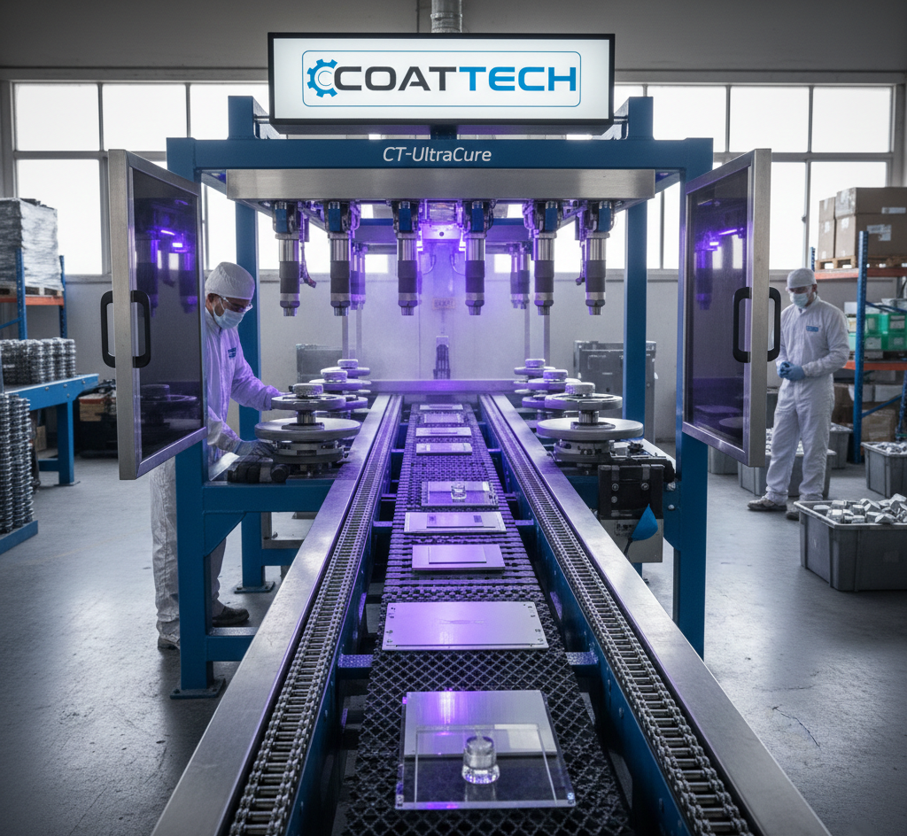 Der CT-UltraCure ist für die sofortige Härtung von flachen oder niedrig profilen Teilen mit UV-empfindlichen Materialien ausgelegt.Teile durchlaufen einen lichtgeschützten Tunnel unter hochintensen Quecksilber- oder LED-UV-LampenDies ermöglicht es, Teile sofort am Ende der Leitung zu stapeln oder zu verpacken.