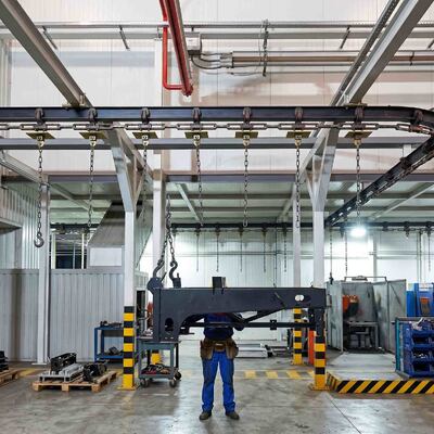 Wie in unserer Anlage demonstriert, können die robusten Fallketten und speziell entwickelten Lastaufhänger Werkstücke mit mehreren Tonnen sicher und reibungslos transportieren, wodurch der Boden frei bleibt und der Bedarf an sperrigen Bodentrolleys entfällt.