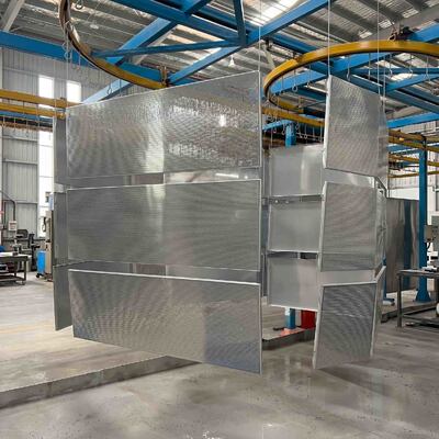 Ein schweres Luftfördersystem, das große Metallplatten kontinuierlich durch eine automatisierte industrielle Pulverbeschichtung und Backleitung transportiert.